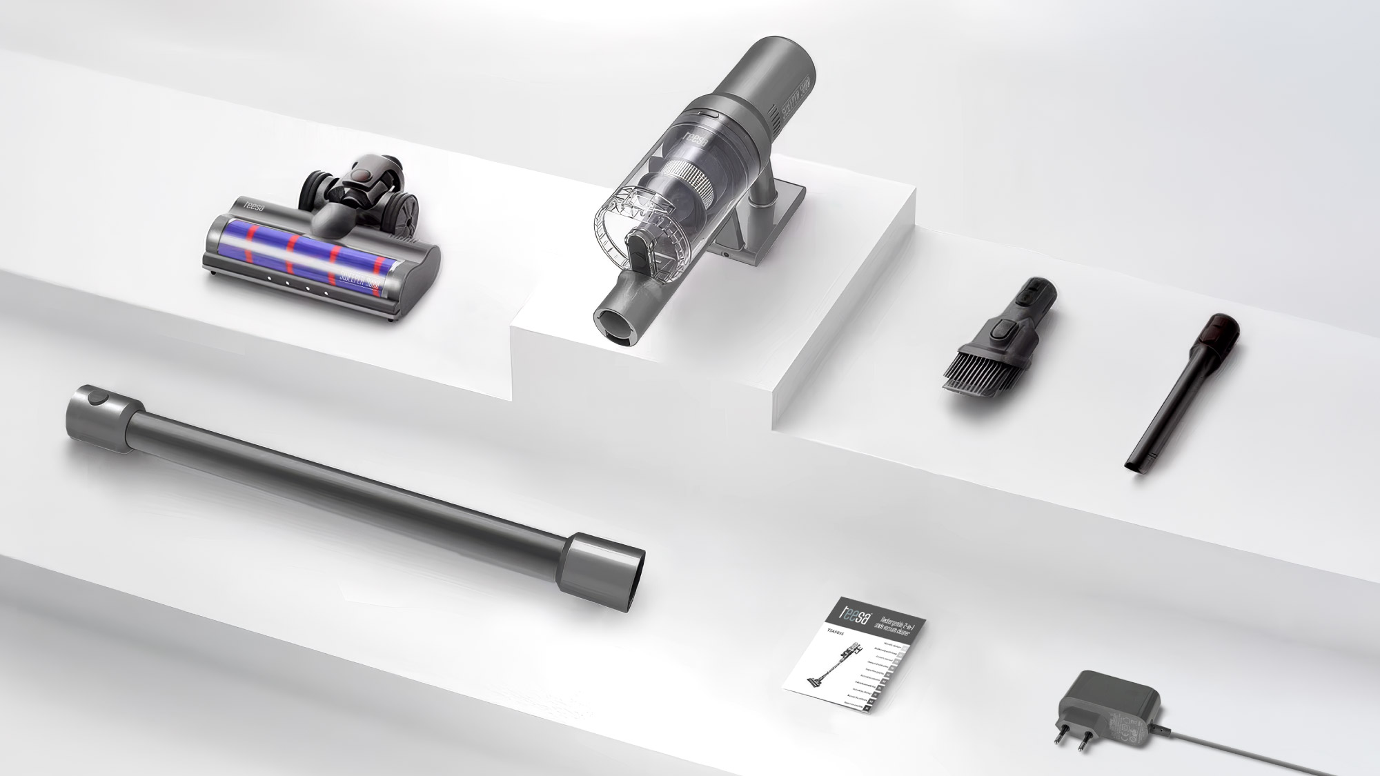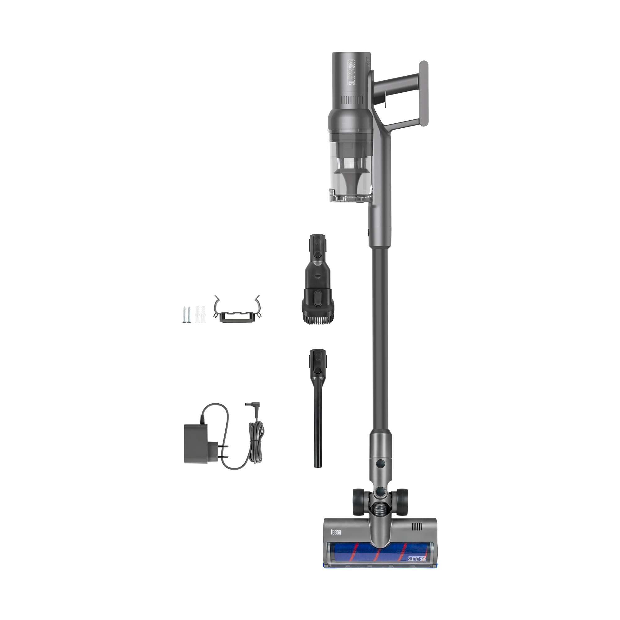 W komplecie z odkurzaczem Teesa Sweeper 9000 znajduje się elektroszczotka do podłóg, końcówka szczelinowa 2w1, dodatkowa ssawka szczelinowa oraz ładowarka sieciowa. Bogaty zestaw akcesoriów pozwala od razu rozpocząć sprzątanie w każdej przestrzeni.